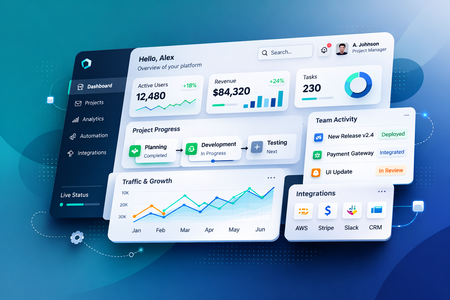 Marketing sites, customer portals, and operations dashboards.